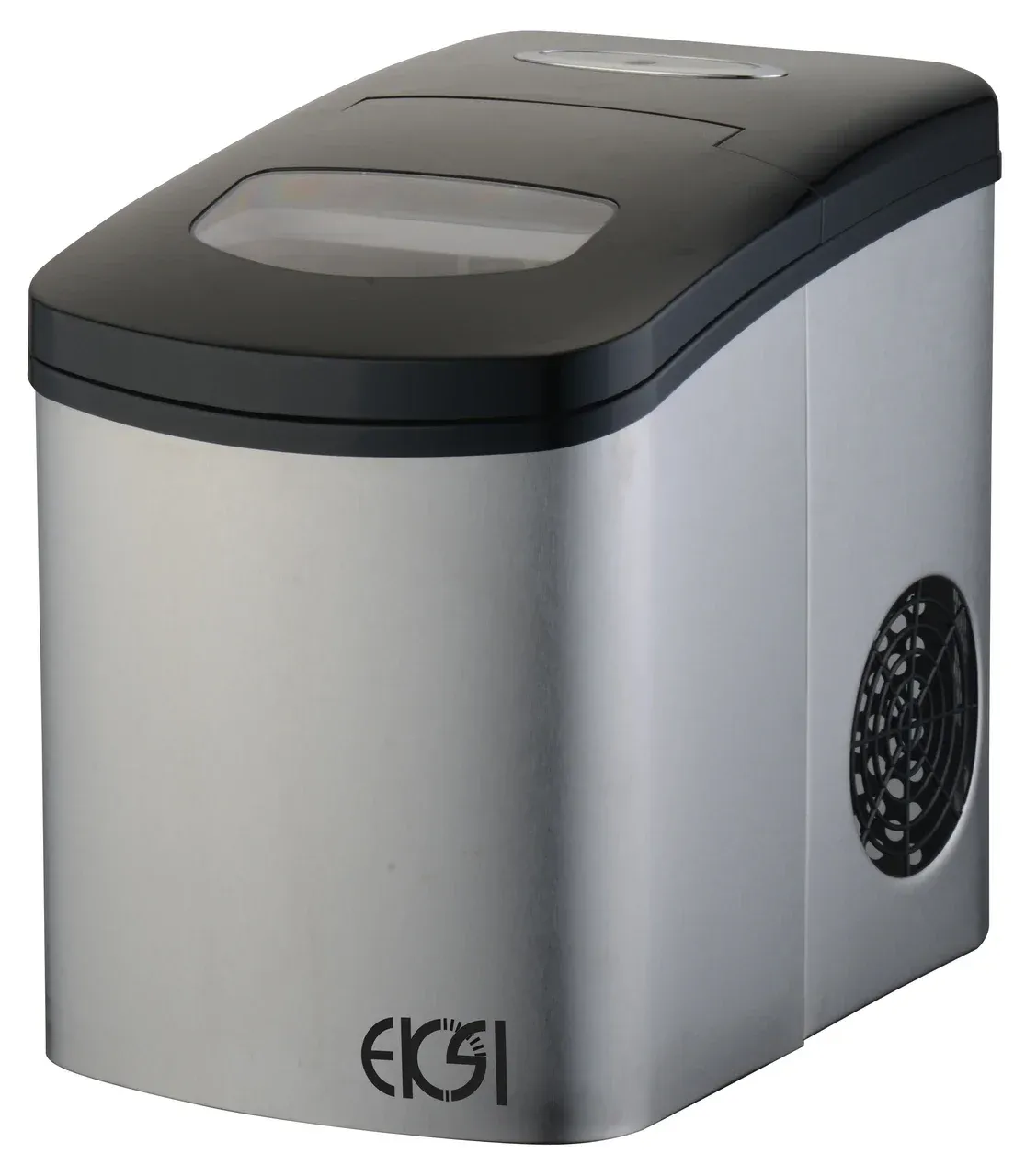 Льдогенератор EKSI серии EB, мод. EB 12A, производительность 12 кг/сутки, объем бункера 600 гр., материал корпуса: нержавеющая сталь, тип льда: пальчиковый, тип подачи воды: заливной, тип охлаждения: воздушный, размер льда 3 см длина, 2,5 см диаметр, возможность регулирования размера льда - нет, вес 11,5кг