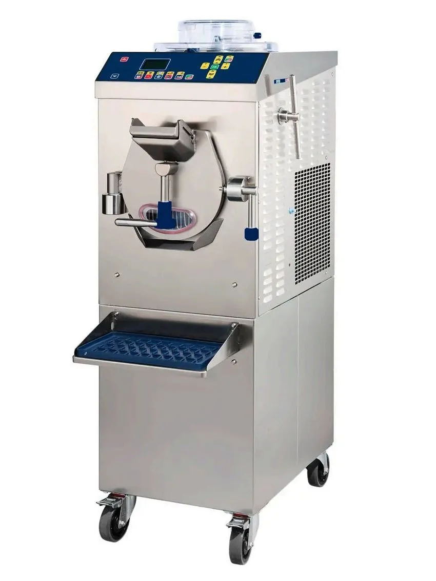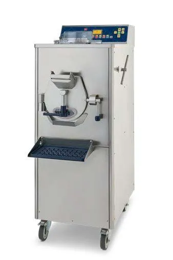 485x798x1343 мм, 380 В /3 Ф, 3,4 кВт, 155 кг. Комбинированный фризер-пастеризатор для приготовления мороженого и кондитерских кремов. Фризер (нижний цилиндр): загрузка за цикл 1,15-4 кг, производительность 22 кг/час (30 л/час). Пастеризатор (верхний цилиндр): загрузка за цикл до 4 кг, нагрев до +115C, охлаждение до +4C, внутренний канал перелива во фризер. Мешалки сталь AISI 304, саморегулирующиеся скребки, регулируемая скорость вращения. Электронный контроллер, 32+32 программы, 2 инвертора. Функция размораживания цилиндра. Воздушное охлаждение конденсатора. Корпус нержавеющая сталь.