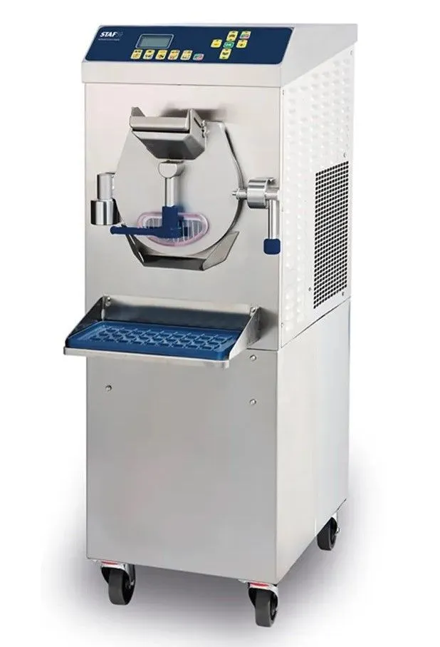 600x830x1388 мм, 380 В /3 Ф, 5,8 кВт, 257 кг. Фризер для твердого мороженого / джелато. Загрузка за цикл 2,3-8 кг. Производительность 48 кг/час (60 л/час). Горизонтальный цилиндр, сталь AISI 304. Стальные дверь и мешалка, саморегулирующиеся скребки. Инвертор, регулируемая скорость вращения мешалки. Электронный контроллер, 61 программа. Функция размораживания цилиндра. Душирующее устройство. Корпус нержавеющая сталь. Воздушно-водяное охлаждение конденсатора. Доп опция (приобретается отдельно): насадка для порционной раздачи.
