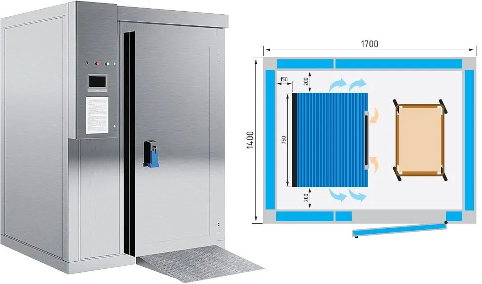 1400*1700*2240 мм, Хладагент R404a, Материал обшивок корпуса снаружи сталь оцинк. с полимерным покрытием, Материал обшивок корпуса изнутри сталь нержавеющая, Охлаждение от … до …* от +90С до +3С, Время охлаждения 90 мин, Масса охлаждаемого продукта, кг 80, Замораживание от … до …* от +90С до -18С, Вместимость 1 тележка под GN1/1 НЕ ВХОДИТ В КОМПЛЕКТ