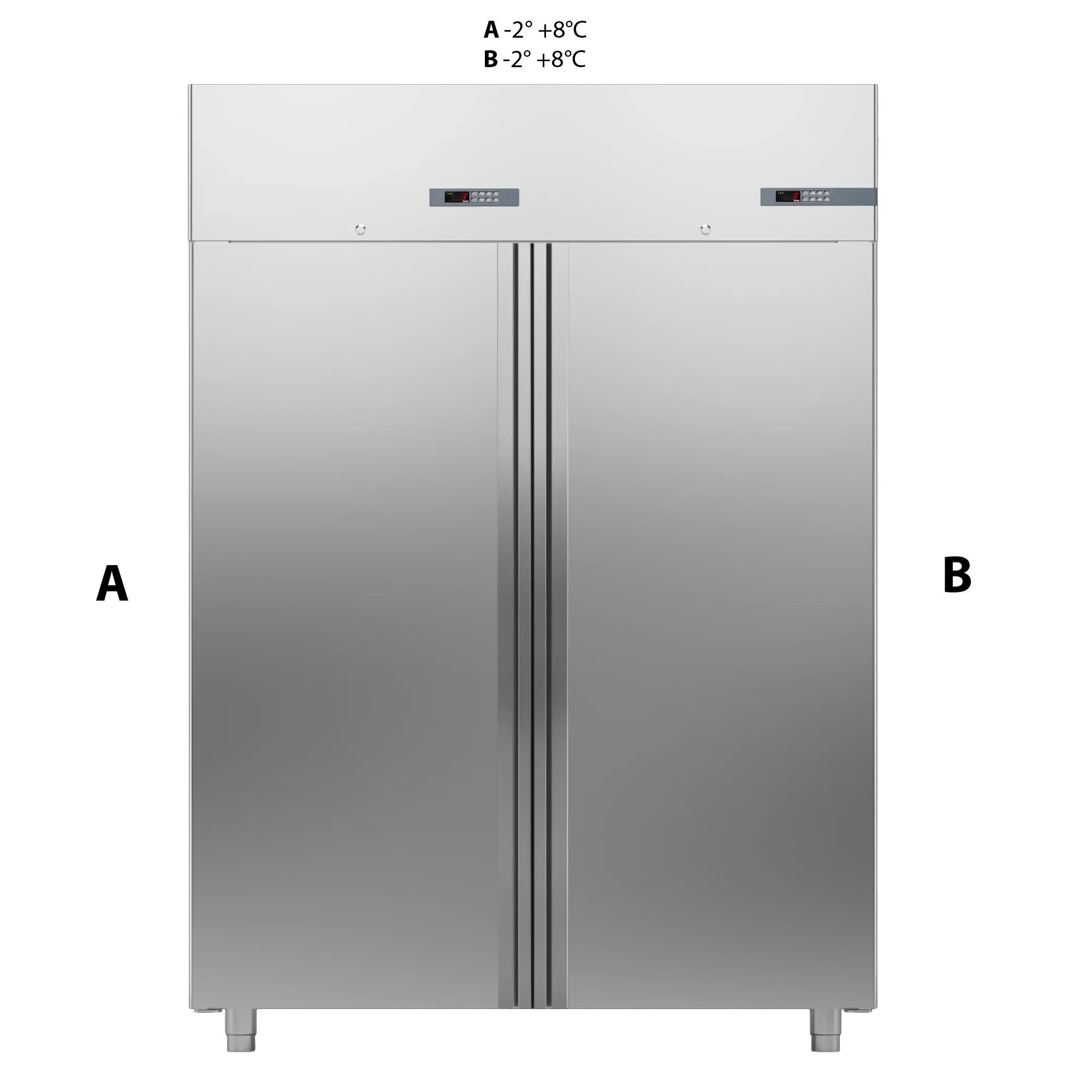 1480х815х2085 мм, 240 кг, 0,44 кВт, 220 В, 1400 литров, от -2 до +8С, энергетический класс С, нерж сталь AISI 304, толщина изоляции 75 мм, подсветка, замок, 2 глухие двери, R290, в комплекте: 6 полок GN2/1, 6 пар направляющих, с агрегатом