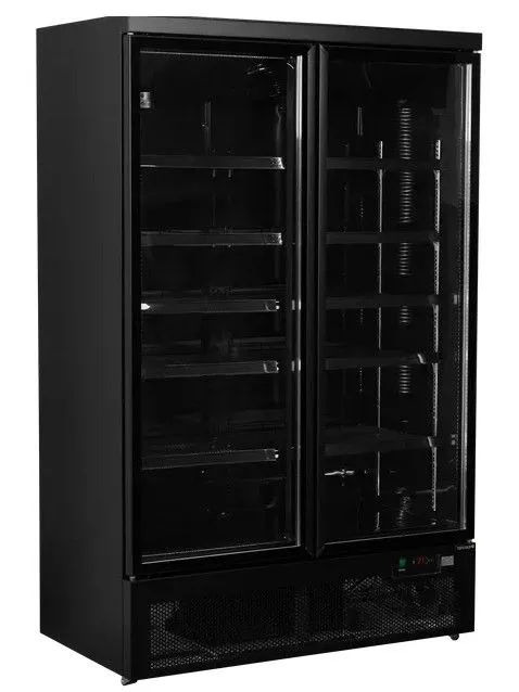1253 x 710 x 2003 мм, 220В, 0,46кВт, 179кг., общий / полезный объем 1081 / 809 л, темп. -1...+10, стеклянные двери, размер полок 566 x 480 мм, 10 черных полок в комплекте