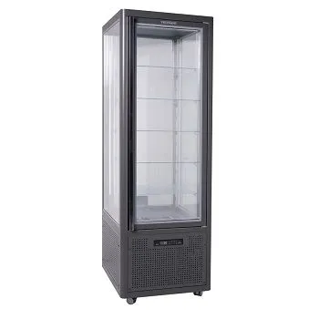 595x640x1890 мм , 220В, 0,54 кВт, -15/-21C, 360 литров, влажность 40%, с встр.агр. R290, стеклянные полки 5 шт. 450x420 мм, окраска - цв.серый. Оттайка (дефростация) автоматическая горячим газом
