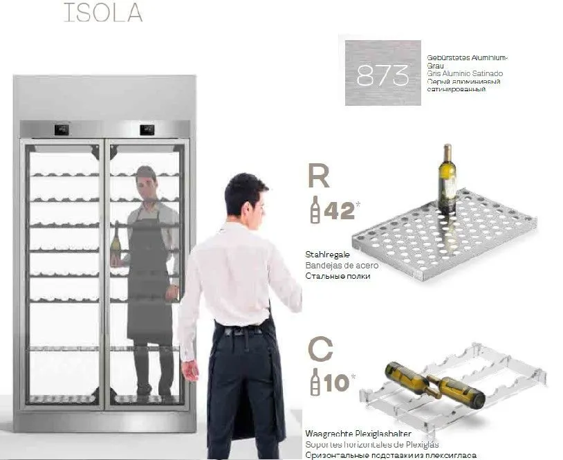 Код A1WI3HV5/873+M220430008+GK20080009, 2125х620х2550 мм, 1,3кВт, 220В, +4...+18С, 580кг, 1725л, I (ISOLA) версия - двери с обеих сторон, до 630 бутылок (зависит от типа полок), с встр.агр. R290, корпус - серый 873, полки R (по 3 шт. на каждую секцию) и полки C (по 4 шт. в каждой секции). Стандартная подсветка включена в стоимость, теплый свет LED