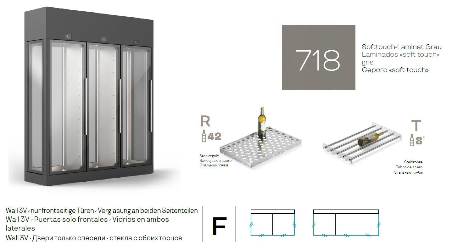 Код A1WF3HV5G/718 MATTE GREY +10PCS*M220430008+10PCS*GK20330004; 1450х630х2150мм, 2,5кВт, 220В, +4/+18 С, 360кг, 1725л, версия с встроенным хол. агрегатом, R290 фреон, цвет корпуса серый матовый (код 718). 3 двери со стеклом спереди, стеклянные боковые панели, глухая задняя стенка. Вместимость макс. до 630 бутылок (зависит от типа установленных полок). В данной комплектации: полки R х 10 шт, полки T x 10 шт. суммарная вместимость с этим типом полок до 500 бутылок "Бордо"