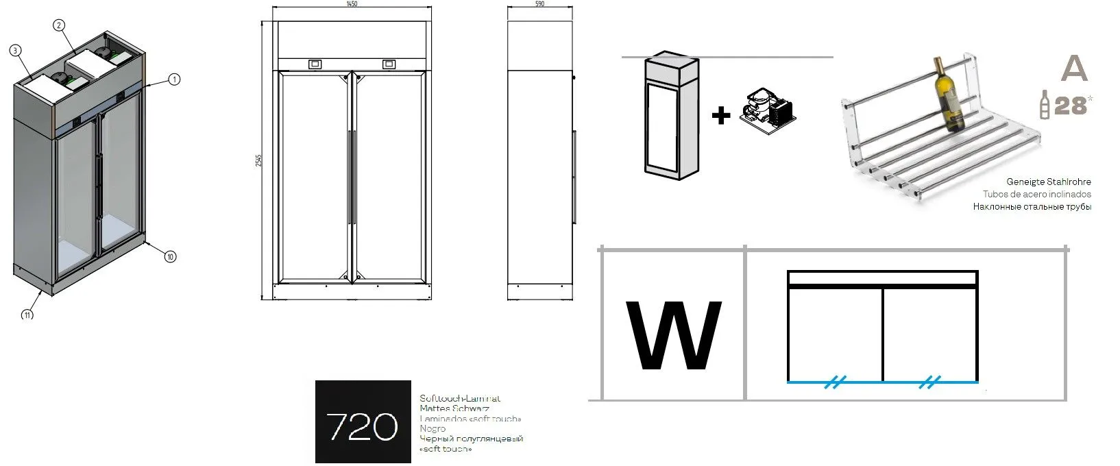 Код A1WW2HV5/720+2 X OPT20002+10*GK20330009, 1450х590х2550 мм, 0,9 кВт, 220В, +4...+18С, 520кг, 1150, до 420 бутылок (зависит от типа полок), выносной агрегат (8м макс. расстояние по горизонтали) фреон R290, корпус - черный 720, полки A (по 5 шт. на каждую секцию) 10 шт 280 шт. бутылок макс загрузка шкафа с данными полками. Стандартная подсветка включена в стоимость, теплый свет LED