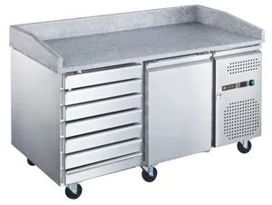 1515x800x1000 мм, 230В, 0,215 кВт, 390 л, -2…+8 C, каменная столешница с 3 бортами, 1 дверь + 7 ящиков, ящики без охлаждения, полка 600х400, одна полка в комплекте, боковое расположение холодильного агрегата, динамическое охлаждение, на колесах
