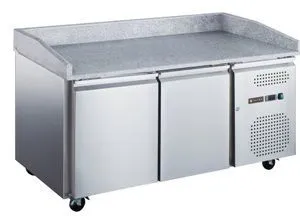 1510x800x1000 мм, 230В, 0,215 кВт, 390 л, -2…+8 C, каменная столешница с 3 бортами, 2 двери, полки 600х400, одна полка для каждой двери в комплекте, боковое расположение холодильного агрегата, динамическое охлаждение, на колесах