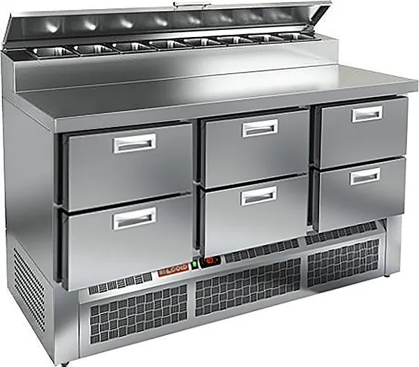 1485х700х850мм, PZE2-222/GN (1/6H) стол для пиццы охл. (+2+10), 6 ящиков, 1485х700х850мм, глуб.раб.пов. 486мм, ниж.распол.агрегата