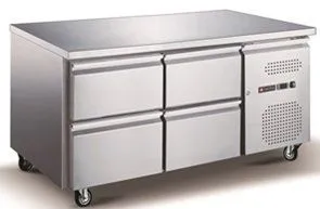 1360x700x850 мм, 230В, 0,215 кВт, 282 л, -2…+8 С, 4 ящика, столешница из нержавеющей стали, без борта, боковое расположение холодильного агрегата, динамическое охлаждение, на колесах