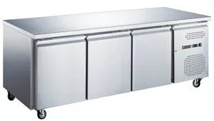 1795x700x850 мм, 230В, 0,23 кВт, 417 л, -2…+8 С, 3 двери, полки GN1/1, одна полка для каждой двери в комплекте, столешница из нержавеющей стали, без борта, боковое расположение холодильного агрегата, динамическое охлаждение, на колесах
