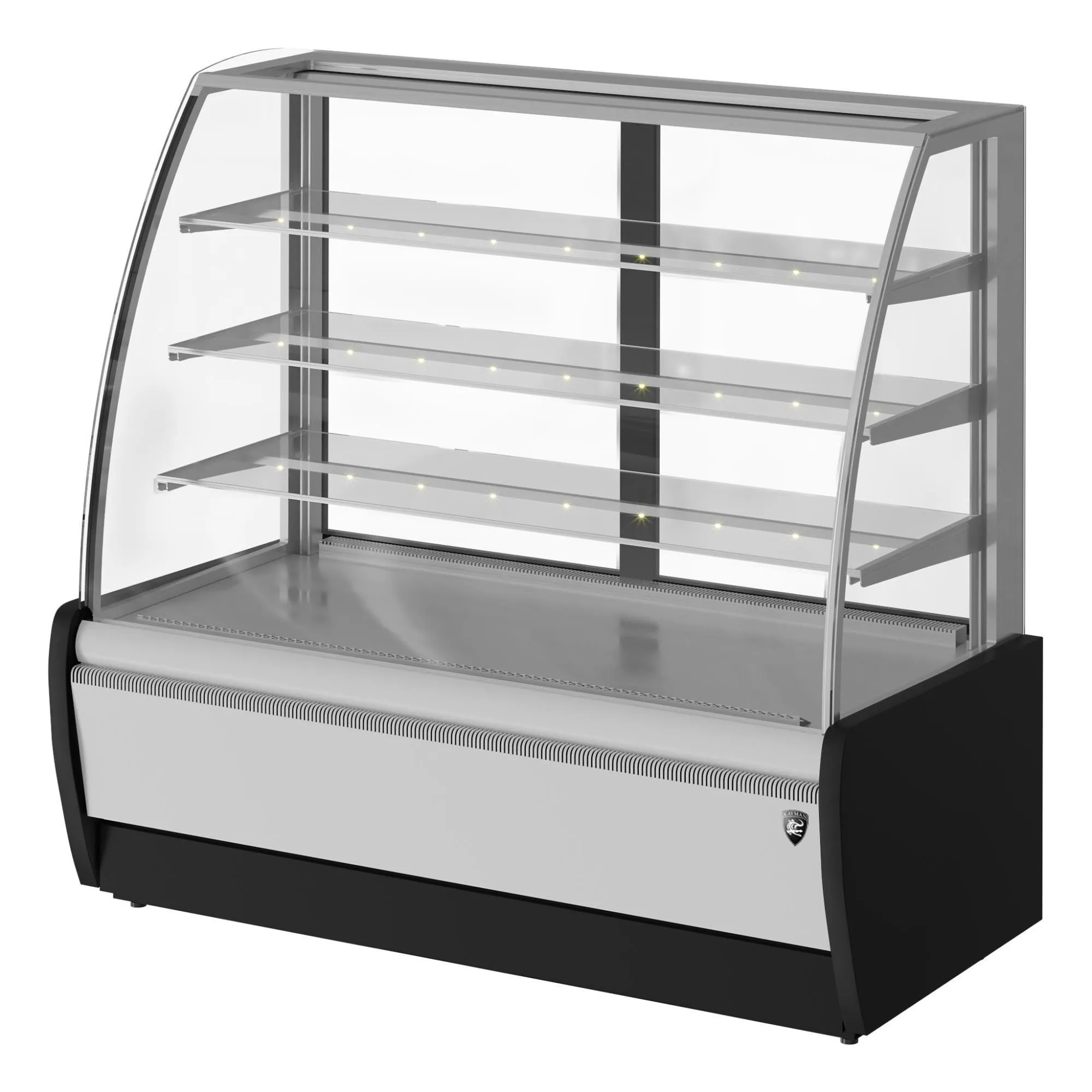 1370х650х1280, t режим +6+12 С. Витрина кондитерская, (+6…+12С),со встроенным агрегатом, гнутое стекло, 3 стеклянные полки с подсветкой LED цвет тепло белый, полезный объем — 0,28м3, размер выкладки - 1310*440, 3 полки: 1310х300мм,, 1310х330мм, 1310х350мм, вентилируемое охлаждение, раздвижные задние шторки, автоматическая оттайка/ТЭНы, потр. эл.энергии в сутки — 7,4кВтч/сутки, 110кг, R134а, цвет корпуса — серый, черный, 220В,0,7кВт