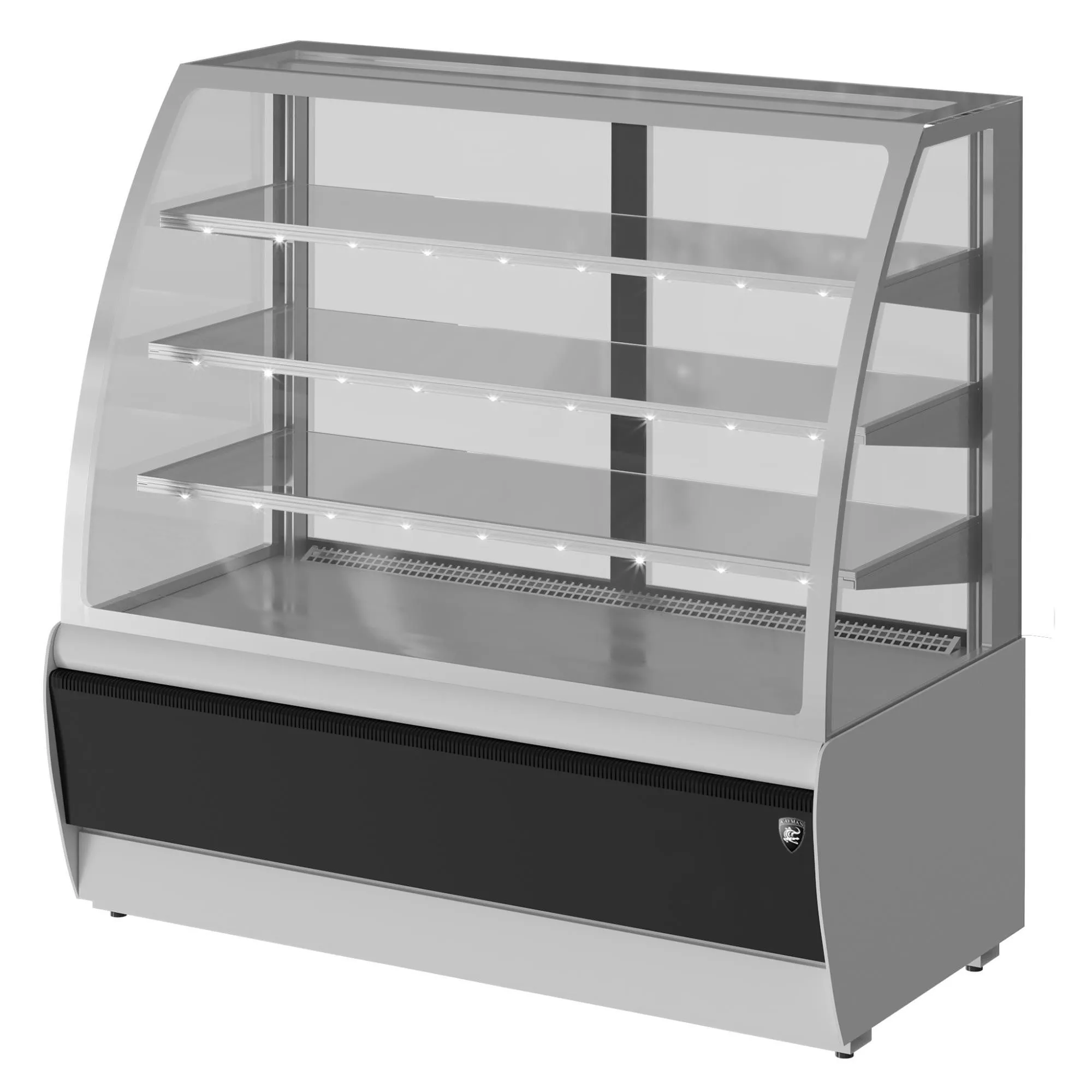 900*700*1280, t режим …0+7 С. Витрина кондитерская, (0…+7С),со встроенным агрегатом, гнутое стекло, стеклопакет, 3 стеклянные полки с подсветкой LED свет тепло-белый, полезный объем — 0,19м3, размер выкладки - 836*460, 3 полки: 830*350, экспозиционная охлаждаемая площадь — 1,26м2, вентилируемое охлаждение, раздвижные задние створки, автоматическая оттайка/ТЭНы, выпариватель, потр. эл.энергии в сутки — 7кВтч/сутки, 130кг, R134а, цвет корпуса —серый/черный, 220В, 0,7кВт