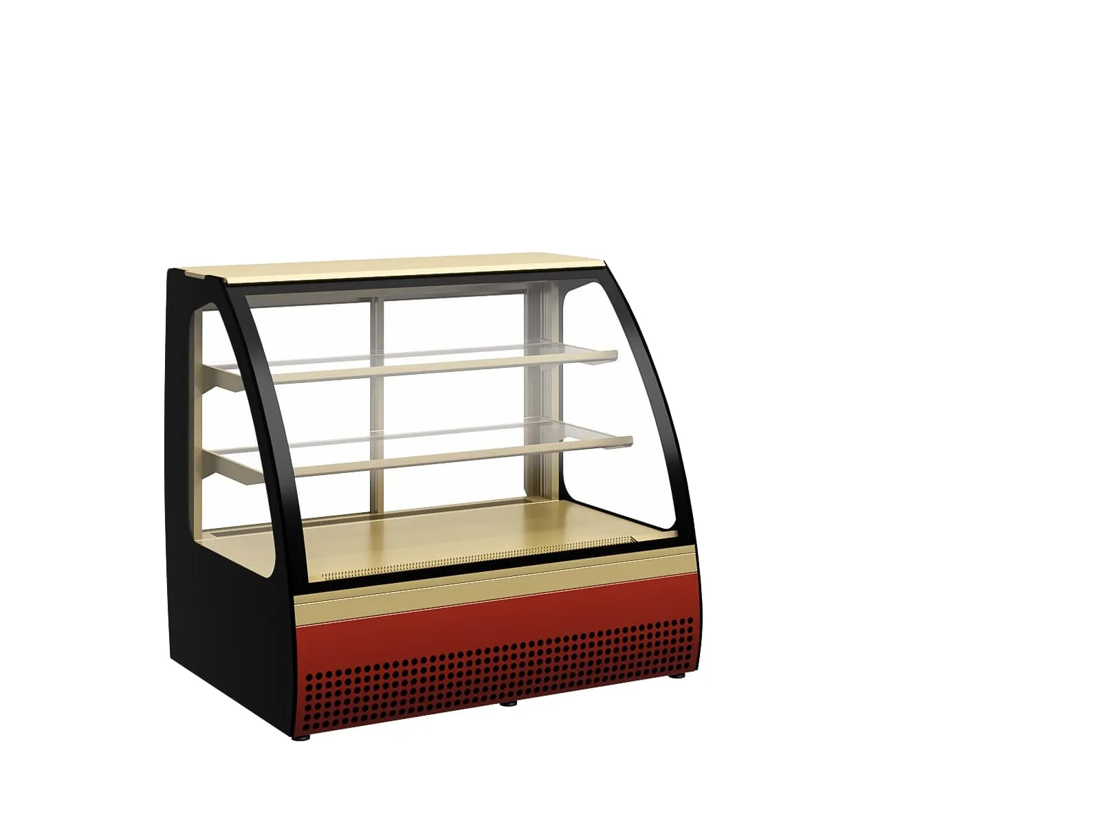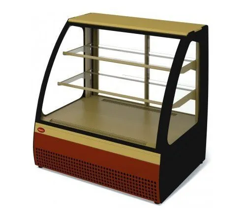 950х730х875 t режим +1…+10 C. Витрина холодильная,со встроенным агрегатом, гнутое стекло, 2 стеклянные полки, полезный объем —0,18 м3,охлаждаемая площадь поддонов для выкладки продуктов, 0,95 м2, динамическое охлаждение, раздвижные задние шторки, оттайка ТЭН, потр. эл.энергии в сутки —3,1 кВт, цвет корпуса — черный, экспозиционные поверхности — отделка под золото, 14,4Вт, 220В.