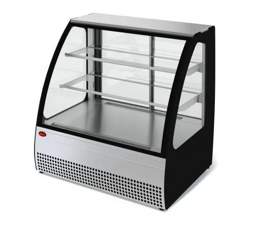 950х730х875 t режим + 1…+10 C. Витрина холодильная,со встроенным агрегатом, гнутое стекло, 2 стеклянные полки, полезный объем —0,18 м3,охлаждаемая площадь поддонов для выкладки продуктов, 0,95 м2, динамическое охлаждение, раздвижные задние шторки, оттайка ТЭН, потр. эл.энергии в сутки —3,1 кВт, цвет корпуса — черный, экспозиционные поверхности — отделка под серебро, 14,4Вт, 220В.
