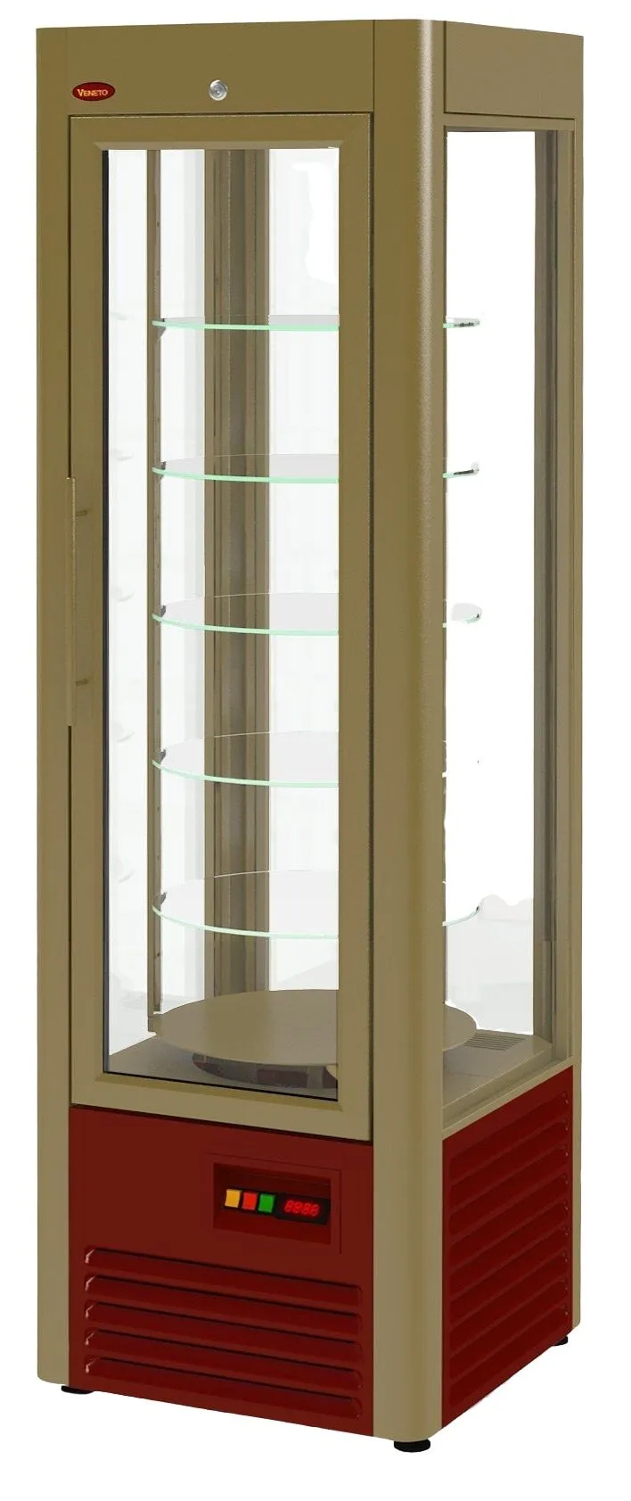 600х600х1930мм, t режим +1…+10 C, 5 стеклянных полок, 1 металлическая полка, полезный объем —0,22 м3, охлаждаемая площадь поддонов для выкладки продуктов 1,1 м2, динамическое охлаждение, раздвижные задние шторки, оттайка ТЭН, потр. эл.энергии в сутки —4,5кВт, R290, цвет корпуса — золотой, экспозиционные поверхности — отделка под золото, 220В.