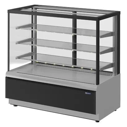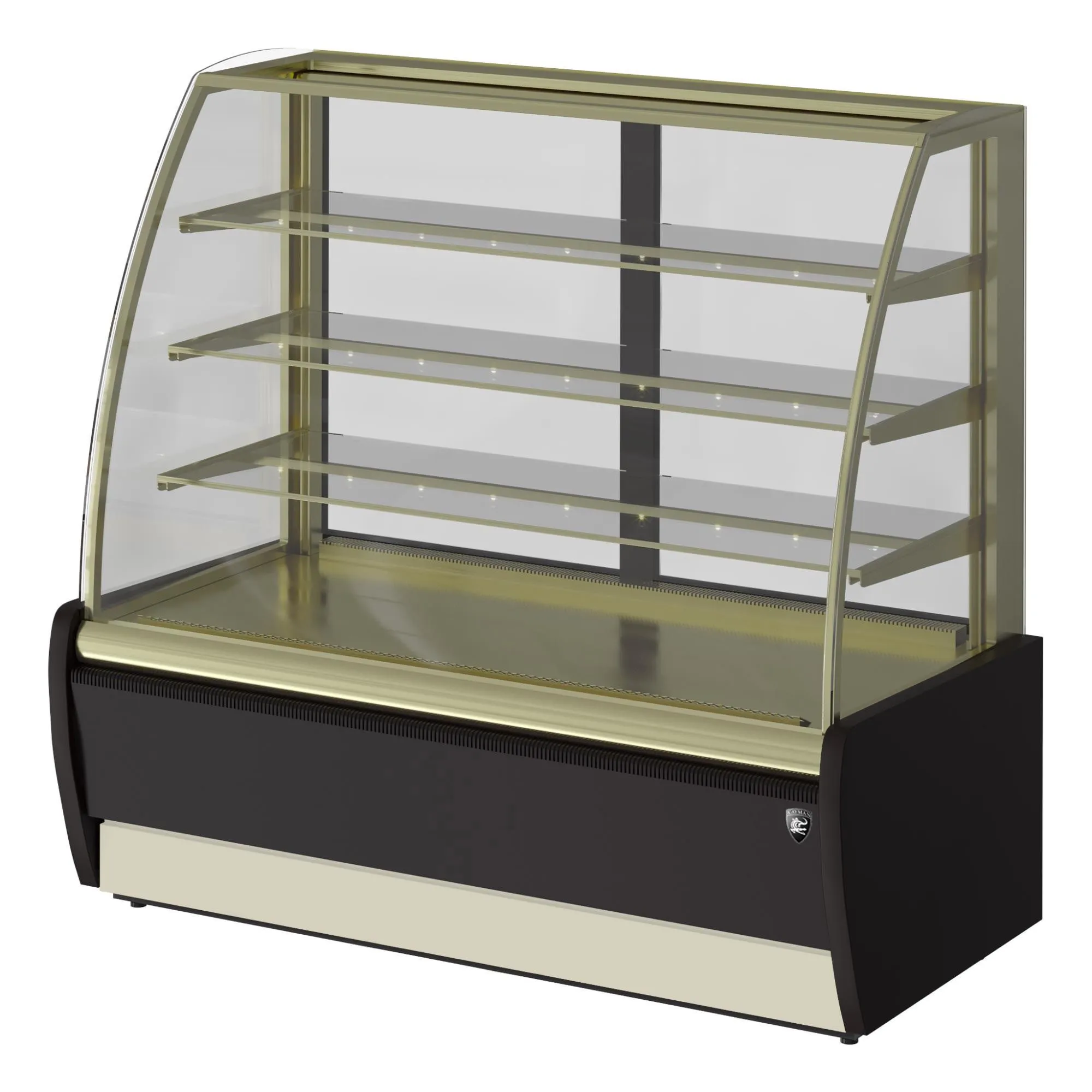 920х650х1280, t режим +6+12 С. Витрина кондитерская, (+6…+12С),со встроенным агрегатом, гнутое стекло, 3 стеклянные полки с подсветкой LED цвет тепло-белый, полезный объем — 0,18м3, размер выкладки - 860*440, 3 полки: 858*300мм, экспозиционная охлаждаемая площадь — 1,22м2, вентилируемое охлаждение, раздвижные задние шторки, автоматическая оттайка/ТЭНы, потр. эл.энергии в сутки — 5,2кВтч/сутки, 90кг, R134а, цвет корпуса — коричневый, экспозиционные поверхности — отделка под золото, 0,65кВт, 220В