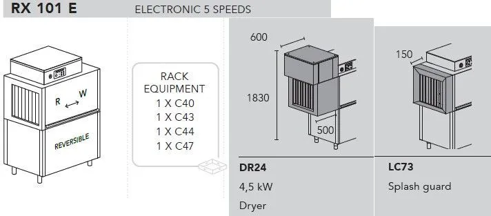1830*715*1830/1900мм, 380В, 26.7кВт, 66-100 кас/ч 5 скоростей, до 1800 тар/ч, DDE - комплект дозаторов, DR24 - сушка 4,5 кВт; LC73 - защита от брызг с одной стороны; корзины в комплекте: С40 для тарелок, C44 для бокалов, С43 для GN1/1, C47 для приборов; DX - движение СПРАВА-НАЛЕВО