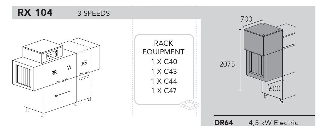 2300x805x1830/2120 H, 380В, 29.2кВт, 3 скорости 80-112 кас/ч, XP - бойлер повышенной мощности для подкл. к холодной воде, DR64 - сушка 4,5кВт, корзины в комплекте: С40 для тарелок, C44 для бокалов, С43 для GN1/1, C47 для приборов; SX - движение СЛЕВА-НАПРАВО, без дозаторов моющ. и опол. средств