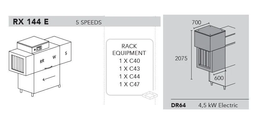 2500x805х2070мм, 380В, 34,35 кВт, 93-144 кас/ч (3 скорости), XP - доп. мощность для подключения к холодной воде, DDE - дозатор моющих и ополас. средств, DR64 - сушка, корзины в комплекте: С40 для тарелок, C44 для бокалов, С43 для GN1/1, C47 для приборов, DX - движение СПРАВА-НАЛЕВО, разделение на 2 части для удобства транспортировки и заноса в помещение.