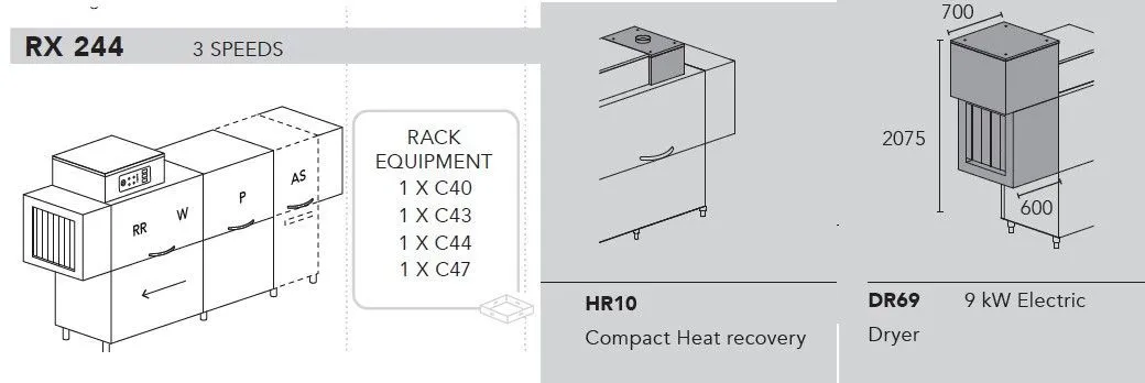3200*805*1830/2120, (длина машины с учетом сушки) 380В, 43.1 кВт, 134-238 кас/ч, DDE - дозатор моющих и ополаск. средств, DR69 - сушка, HR10 - компакт. теплорекуператор - консоль: для подключения к холодной воде (потреб. энергии, t и влажн. воздуха в помещен. ниже, чем при доп. мощности), корзины в комплекте: С40 для тарелок, C44 для бокалов, С43 для GN1/1, C47 для приборов, DX - движение СПРАВА-НАЛЕВО, деление на 2 части,