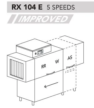2300x805x1830/2120мм, 380В, 30,7кВт, 83-107 кас/ч, E - электронная панель управления, DDE - дозатор моющих и ополас. средств, HR10 - компакт. теплорекуператор - консоль: для подключения к холодной воде (потреб. энергии, t и влажн. воздуха в помещен. ниже, чем при доп. мощности), DR64 - сушка поворотная, корзины в комплекте: С40 для тарелок, C44 для бокалов, С43 для GN1/1, C47 для приборов, DX - движение СПРАВА-НАЛЕВО