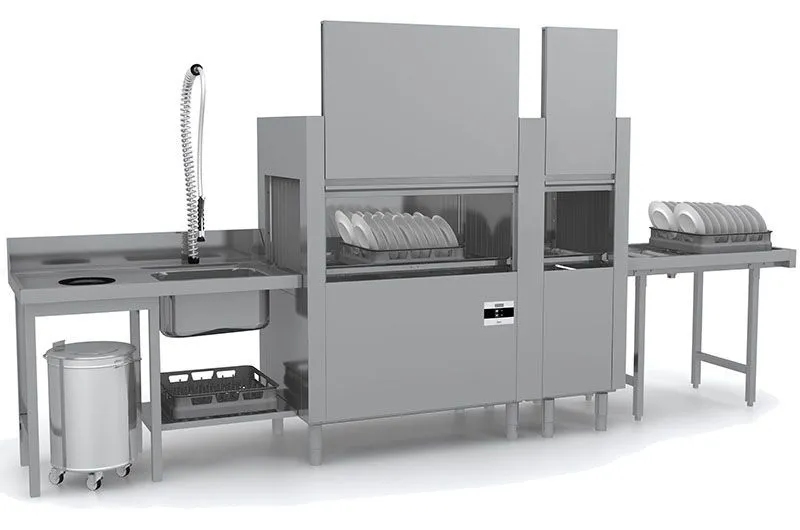2331*770*1615 мм, 25,1 кВт, 380 В, производительность 200 кассет/час, мойка, усиленное ополаскивание, в комплекте входной нейтральный модуль, сушка, защита от брызг на вход и выход, дозаторы, all inox