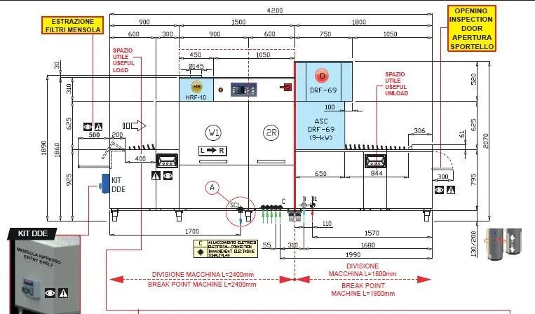 4200x983x2070мм, DDE - дозатор моющих и ополас. средств, корпус нерж AISI 304, стандартная пальчиковая лента, DRF69 - сушка-консоль (9 кВт), HRF10 - компактный теплорекуператор: для подключения к холодной воде (потреб. энергии, t и влажн. воздуха в помещен. ниже, чем при доп. мощности), ополаскивание усиленное 2+ (расход воды 190 л/час), DDE - дозаторы моющего и ополаск. средств, MI900 - исполнение с укороченным загрузочным модулем (900мм), SX - движение СЛЕВА-НАПРАВО, деление на 2 части