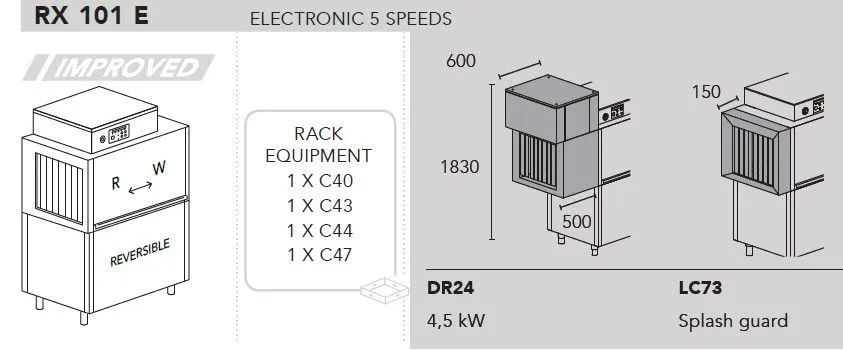 1830*715*1830/1900мм, 380В, 38.7кВт, 70-100 кас/ч, до 1800 тар/ч. Е-электронная панель управления (5 скоростей), XP - бойлер увеличенной мощности для подкл. к хол. воде, DDE - комплект дозаторов, DR24 - сушка 4,5 кВт; LC73 - улучшенный модуль шторок на входе обеспечит защиту от брызг с одной стороны; корзины в комплекте: С40 для тарелок, C44 для бокалов, С43 для GN1/1, C47 для приборов; SX - движение СЛЕВА-НАПРАВО,