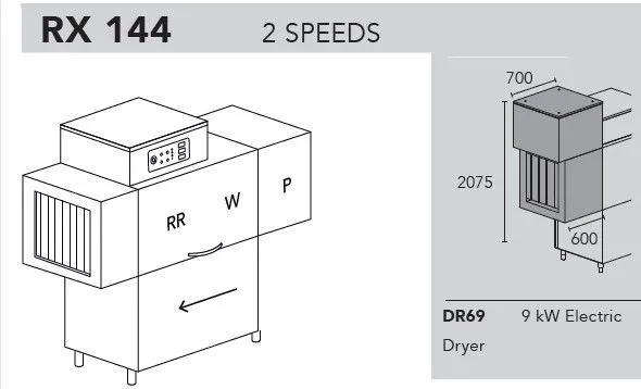 2500x805x2075/2120 H, 380В, 38.6кВт, 92-143 кас/ч, DDE - дозаторы моющего и ополаск. средств, DR69 - сушка 9 кВт, XP (EXP, Extra Power) - доп. мощность ТЭНов бойлера для подключения к холодной воде, корзины в комплекте: С40 для тарелок, C44 для бокалов, С43 для GN1/1, C47 для приборов, DX - движение СПРАВА НАЛЕВО