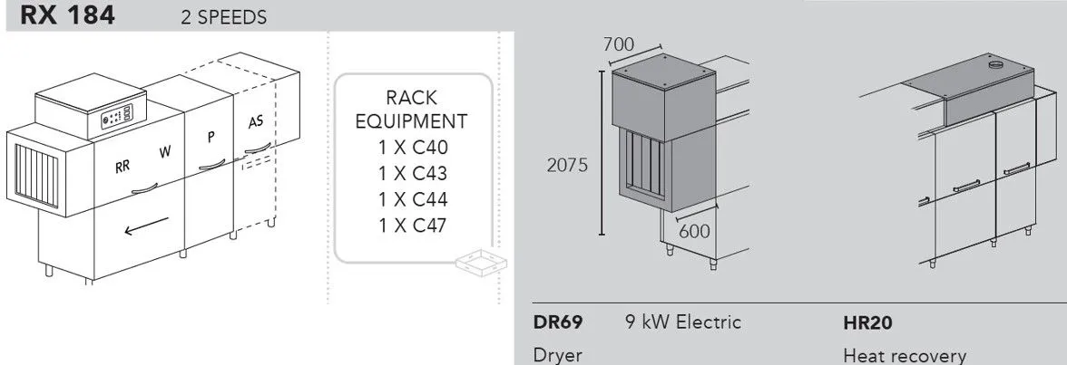 2900x805x1830/2120 H, 380В, 38.82кВт, 116-190 кас/ч, HR20 - теплорекуператор - консоль: для подключения к холодной воде (потреб. энергии, t и влажн. воздуха в помещен. ниже, чем при доп. мощности), DR69 - сушка, корзины в комплекте: С40 для тарелок, C44 для бокалов, С43 для GN1/1, C47 для приборов, SX - движение СЛЕВА-НАПРАВО, без дозаторов моющего и ополаск. средств