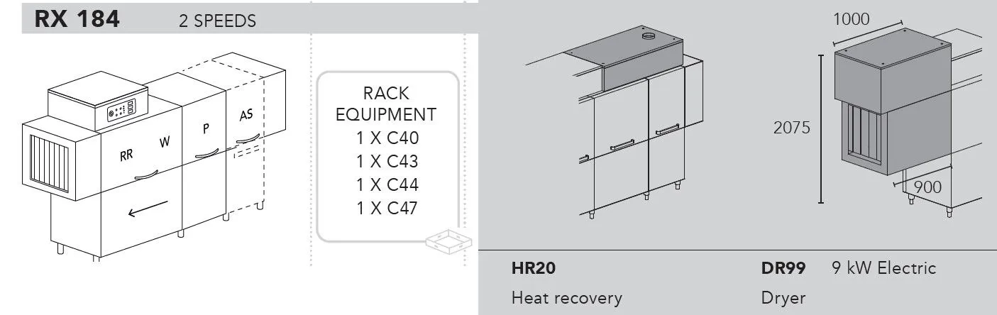 3200x805x1830/2120 мм (2070мм высота в районе модуля сушки), 380В, 36.37кВт, 116-190 кас/ч, HR20 - теплорекуператор - консоль: для подключения к холодной воде (потреб. энергии, t и влажн. воздуха в помещен. ниже, чем при доп. мощности), DR99 - сушка прямая 9 кВт, корзины в комплекте: С40 для тарелок, C44 для бокалов, С43 для GN1/1, C47 для приборов, SX - движение СЛЕВА-НАПРАВО, без дозаторов моющего и ополаск. средств. Разделение на 2 части для облегчения транспортировки и отгрузки. Без дозаторов моющего и ополаск. средства
