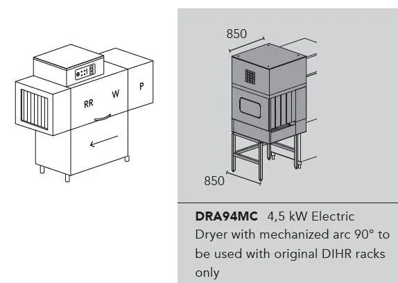 2950x850х1830/2120 мм, 380В, 34,10кВт, 92-143 кас/ч электромех. панель управления 3 скорости, 3 секции: предварительная мойка, основная мойка и двойное усиленное ополаскивание. Опции включенные в компектацию: XP - доп. мощность для подключения к холодной воде, DDE - дозатор моющих и ополас. средств, DRA94MC - сушка поворотная 90 градусов 4.5кВт, корзины в комплекте: С40 для тарелок, C44 для бокалов, С43 для GN1/1, C47 для приборов, DX - движение СПРАВА-НАЛЕВО,