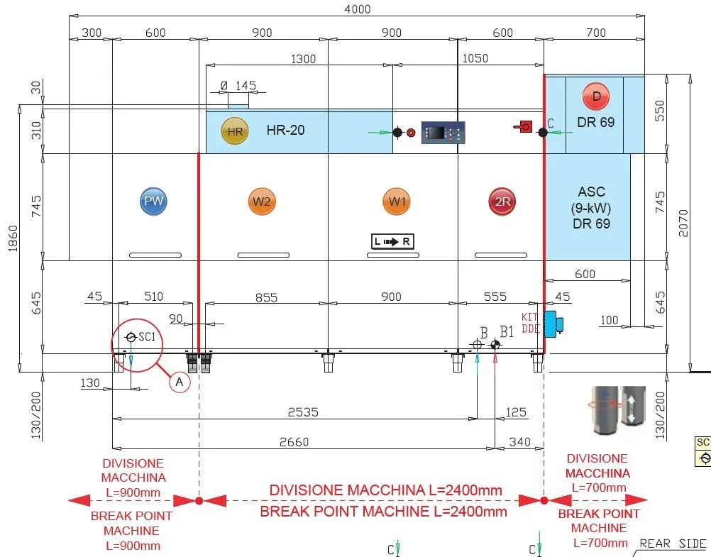 4000x805х1830/2120мм, 380В, 50,81 кВт, 190-360 кас/ч, 5 скоростей, двойное ополаскивание, комплект дозаторов (DDE-GROUP), HR20 - теплорекуператор - консоль: для подключения к холодной воде (потреб. энергии, t и влажн. воздуха в помещен. ниже, чем при доп. мощности), DR69 - прямая сушка 9 кВт (+400 мм к общей длине машины) корзины в комплекте: С40 для тарелок, C44 для бокалов, С43 для GN1/1, C47 для приборов, размер корзин 500*500мм. SX - направление движения посуды СЛЕВА-НАПРАВО, деление машины на 3 части для облегчения перевозки, транпортировки и заноса в помещение,
