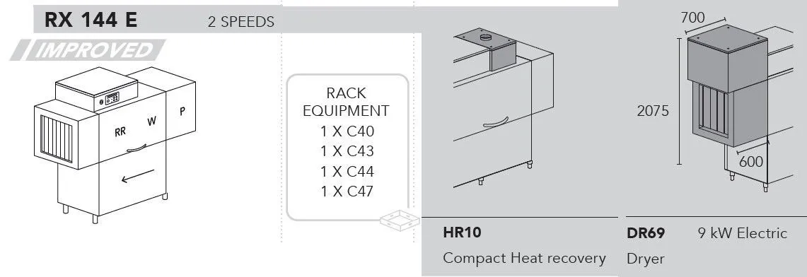 2500x805x1830/2120мм, 400В, 35.65 кВт, 92-143 кас/ч, E - электронная панель управления 5 cкоростей (обновление с сентября 2023г), DR69 - сушка 9 кВт, HR10 - теплорекуператор для подключения к холодной воде (потреб. энергии, t и влажн. воздуха в помещен. ниже, чем при доп. мощности), дозаторы. Кассеты 500х500, 92-143 кассет в час, корзины в комплекте: С40 для тарелок, C44 для бокалов, С43 для GN1/1, C47 для приборов, DX - движение СПРАВА-НАЛЕВО