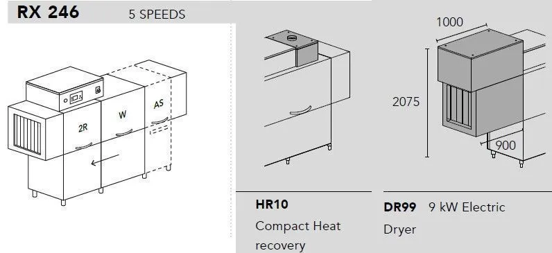2100x805x1830/2120 H + 700 мм по длине сушка DR99 (9 кВт), высота в районе сушки 2075мм, 380В, 33 кВт, 2 секции - мойка и двойное ополаскивание, 100-250 кас/ч, кассета 500*500 мм, диаметр тарелки 450 мм, DDE - дозатор моющих и ополас. средств, DR99 - сушка, SAN, HR10 - компакт. теплорекуператор: для подключения к холодной воде (потреб. энергии, t и влажн. воздуха в помещен. ниже, чем при доп. мощности), корзины в комплекте: С40 для тарелок, C44 для бокалов, С43 для GN1/1, C47 для приборов, DX - движение СПРАВА-НАЛЕВО. Разделение на 2 части для облегчения транспортировки и заноса в помещение