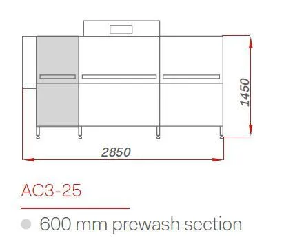 2850x800x1680, электрическая, 400V/50Hz/3N, 36,4 кВт, справа налево, сушильный модуль 600мм. (6кВт нагрев), централизованый слив, дозаторы моющ. и ополаск средств, CWV (cold water boost) доп. мощность ТЭНов бойлера для подкл. к холодной воде