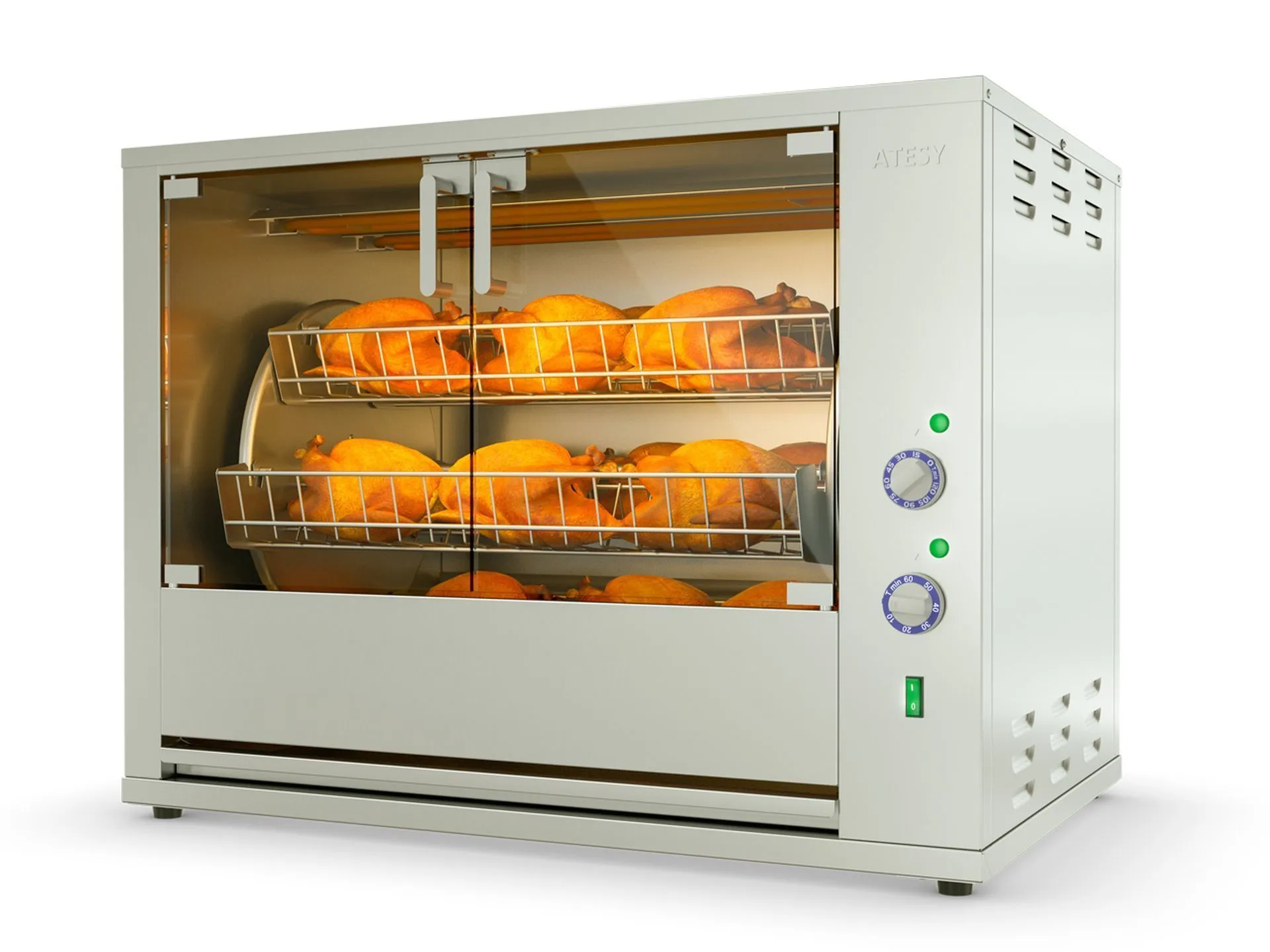 860х580х655мм, 8,0 кВт, 220 В, +50...+250С, встроенный таймер: 15-120 мин, 6 садков, вместимость: 18 кур