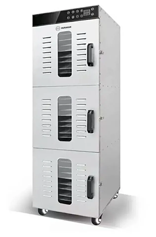 570*455*1360мм, 51кг, 220В, 2,4кВт, 36 уровней, 36 решеток в комплекте, размер решеток 400*380мм, расстояние между решетками 30мм, материал корпуса и решеток нерж. сталь, независимые друг от друга 3 камеры, температурный режим 30-90С