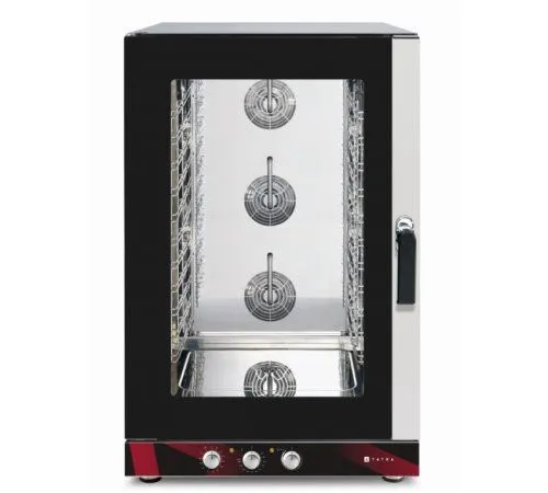 817х825х1317 мм, 400В, 15,8 кВт, 12 уровней GN1/1- 600х400, электромеханическая п/у, инжекторное пароувлажнение, макс. температура 260С, 3 вентилятора, реверс, 1 скорость вращения вентиляторов, таймер