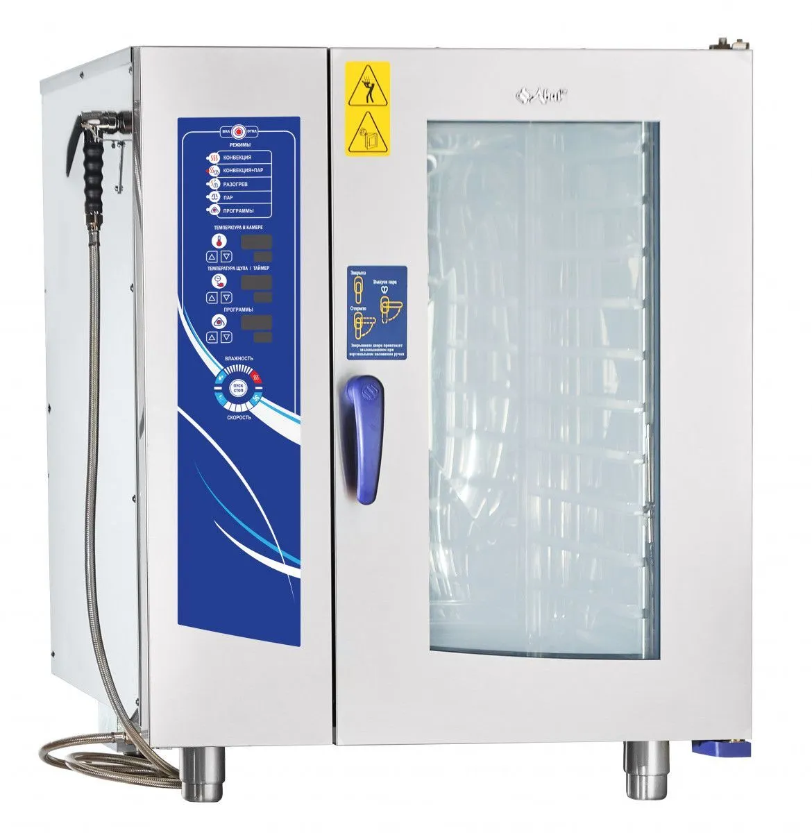 - Двухходовая система открывания защищает сотрудников от контакта с горячим паром