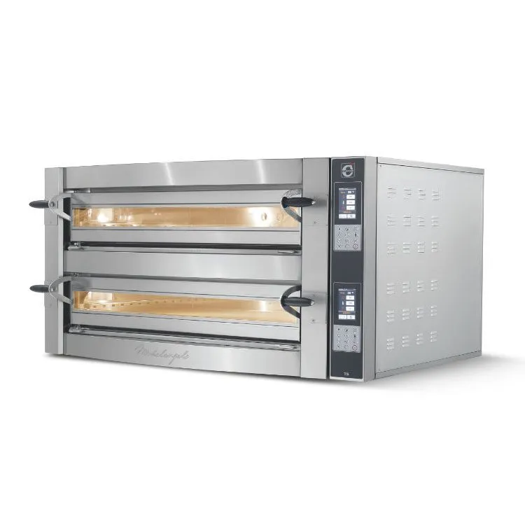 1550х1100х780мм, 17,2кВт, 380В, размер камеры: 1080х720х140мм, вместимость 6+6 пицц по 35см или 2+2 по 50см, двухкамерная моноблочная печь