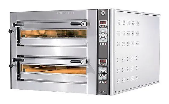 1150х1060х780мм, 380В, 11,6кВт, размер камеры: 720х720х140мм, вместимость 4+4 пицц по 35см или 1+1 по 50см, двухкамерная моноблочная печь