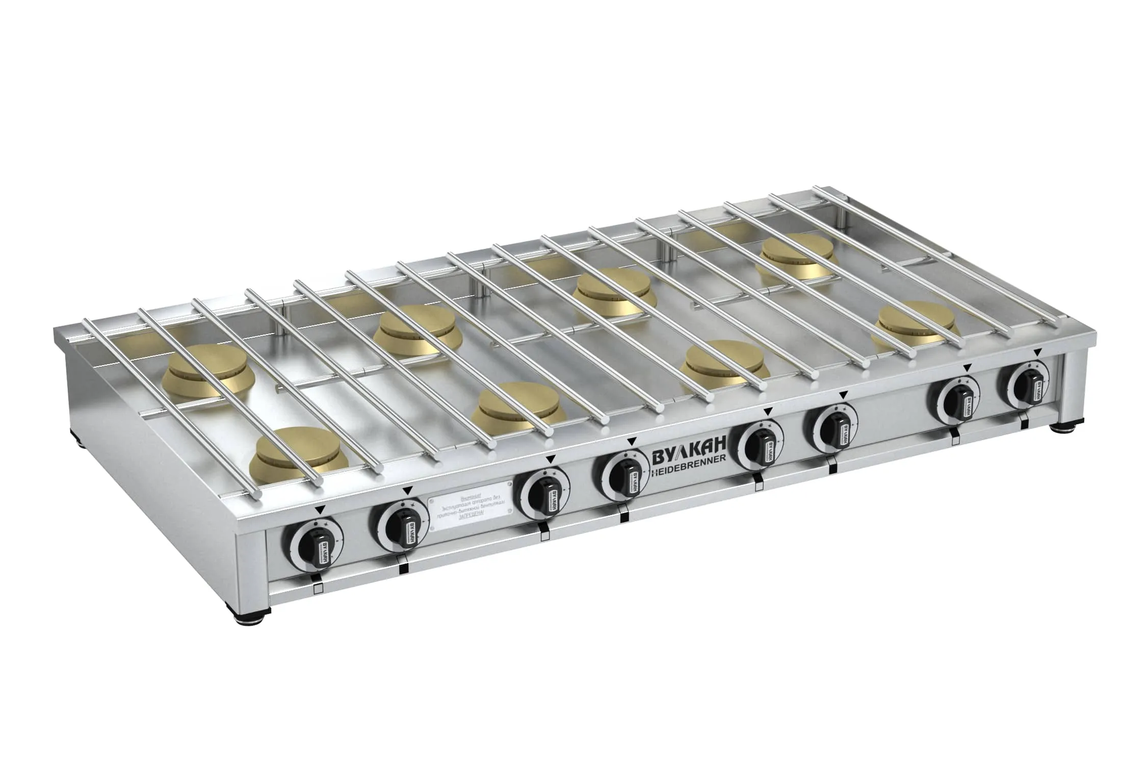 1200х650х150мм, Ультратонкая настольная газовая плита из нержавеющей стали, Возможно одновременное размещение 8 кастрюль объемом 30 л, 8 латунных горелок по 6 кВт каждая, 4 съёмных решетки из нержавеющей стали, газконтроль, работа на природном или сжиженном газе, 8х4,0кВт, Расход газа: прир (сжиж)- 3,25 (2,53)м3?ч (кг/ч) Брутто: 63кг