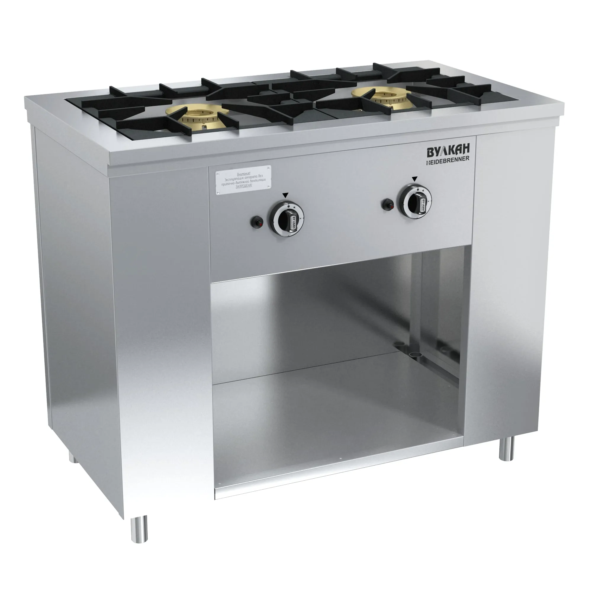 955х555х850мм, Плита с 2-мя латунными двухрядными горелками, каждая имеет массивную чугунную решетку размером 430х430 мм. Съёмная подконфорочная емкость. В нижней части плиты имеется ниша для хранения кухонного инвентаря. Газконтроль, пьезоподжиг каждой горелки, работа на природном или сжиженном газе. Ножки плиты регулируются по высоте, 2x8,0кВт. Расход газа: прир (сжиж)-1,66 (1,30)м3?ч (кг/ч) Брутто: 90кг