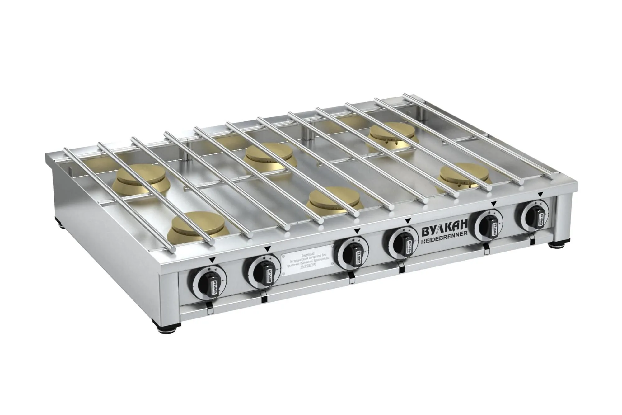 900х650х150мм, Ультратонкая настольная газовая плита из нержавеющей стали. Возможно одновременное размещение 6 кастрюль объемом 30 л. 6 латунных горелок по 6 кВт каждая, 3 съёмных решетки из нержавеющей стали, газконтроль, работа на природном или сжиженном газе, 6x4,0кВт, Расход газа: прир (сжиж)-2,44 (1,90)м3?ч (кг/ч), Брутто: 46кг