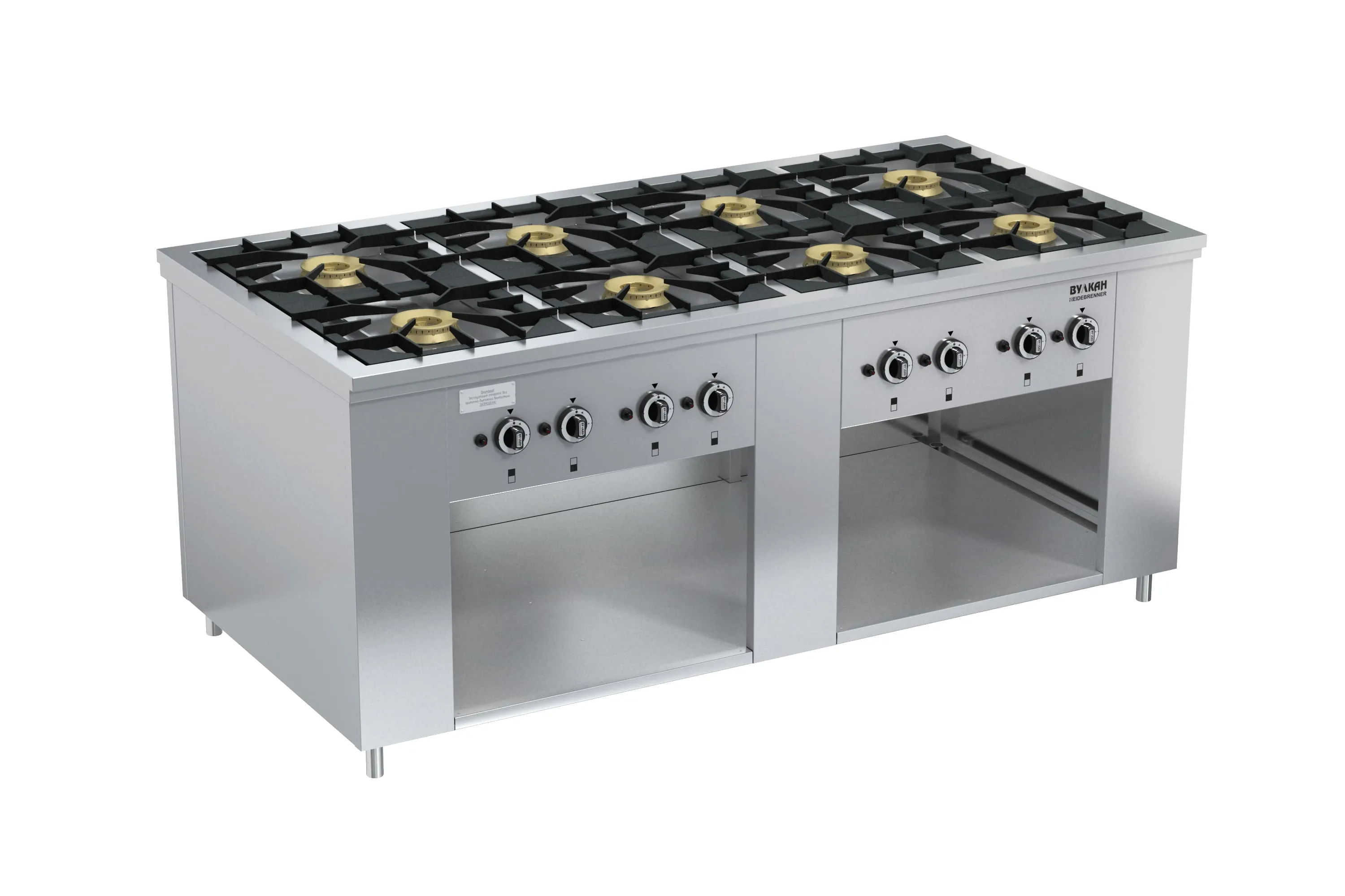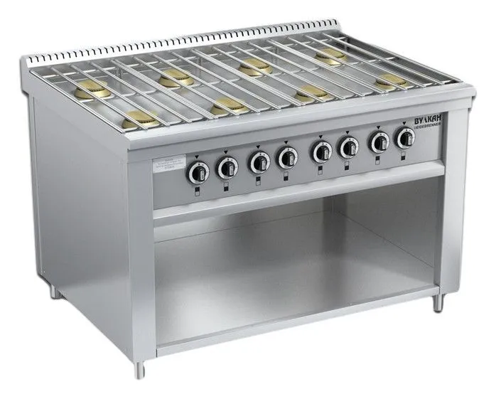 1200х900х850мм, Плита из нержавеющей стали с 8-ю горелками по 6 кВт, съёмной решеткой из нержавеющей стали. В нижней части плиты имеется ниша для хранения кухонного инвентаря, газконтроль, работа на природном или сжиженном газе, герметичная столешница, ножки плиты регулируются по высоте, 8x6,0кВт. Расход газа: прир (сжиж)-4,87 (3,79)-м3?ч (кг/ч), Брутто: 118кг