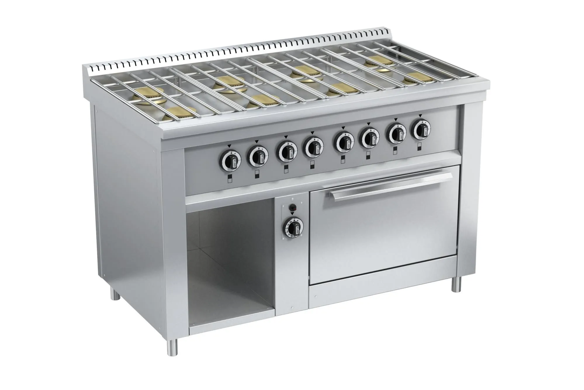1200х700х850мм, Плита из нержавеющей стали с 8-ю горелками по 6 кВт, съёмной решеткой из нержавеющей стали, газовым духовым шкафом, газконтроль, работа на природном или сжиженном газе, герметичная столешница, ножки плиты регулируются по высоте, 8x6,0кВт+ДШх6,0кВт. Расход газа: прир (сжиж)-5,50 (4,28)м3?ч (кг/ч) Брутто: 135кг