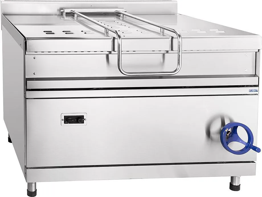 1202х1050х940 мм, Газовая сковорода ГСК-90-0,67-120, цельнотянутая чаша 1100х630х197 мм, площадь дна чаши 0,67 м2, 120 л, опрокидываемая, 900 серия, +100…+340 С, газ-контроль, 2 горелки, 32 кВт