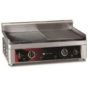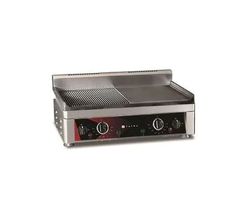 540х350х240 мм, 230В, 2,2 кВт, поверхность 1/2 рифленая, 1/2 гладкая (R+S), чугун, размер поверхности 520х240 мм, две зоны нагрева с независимым управлением, термостат 50- 300C, корпус из нержавеющей стали, емкость для сбора жира